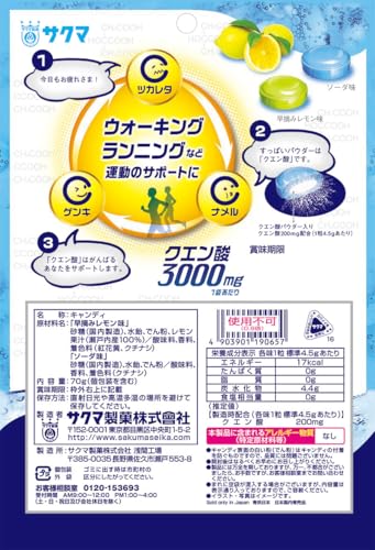 原材料:「早摘みレモン味」砂糖(国内製造)、水飴、でん粉、レモン果汁(瀬戸内産100%)/酸味料、着色料(紅花黄・クチナシ)「ソーダ味」砂糖(国内製造)、水飴、でん粉/酸味料、着色料(クチナシ)