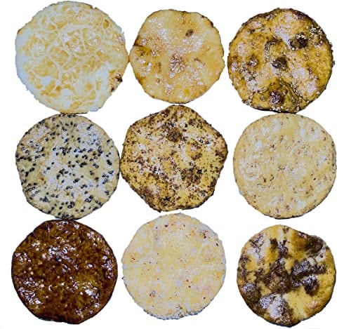 原材料:[みそ]うるち米(国内産100%)、ごま、しょうゆ(小麦・大豆を含む)、砂糖、みそ、みりん、はちみつ、水飴、でん粉、こんぶ調味エキス、しょうが、唐辛子/加工デンプン、カラメル色素、調味料(アミノ酸等)、香辛料抽出物<br>[白ゴマ]うるち米(国内産100%)、白ごま(ごまを含む)、しょうゆ(小麦・大豆を含む)、みりん、砂糖、でん粉、こんぶ調味エキス/調味料(アミノ酸等)、カラメル色素、香辛料抽出物<br>[しょうゆ]うるち米(国内産100%)、しょうゆ(小麦・大豆を含む)、みりん、砂糖、でん粉、こんぶ調味エキス/調味料(アミノ酸等)、カラメル色素、香辛料抽出物<br>[みりん]うるち米(国内産100%)、しょうゆ(小麦・大豆を含む)、砂糖、植物油脂、でん粉分解物、でん粉、みりん、パプリカ、唐辛子、食塩/調味料(アミノ酸等)、カラメル色素<br>[七味]うるち米(国内産100%)、しょうゆ(小麦・大豆を含む)、七味唐辛子(ごまを含む)、みりん、砂糖、でん粉、こんぶ調味エキス、米菓調味料/調味料(アミノ酸等)、カラメル色素、糊料(プルラン)、香辛料抽出物<br>[梅ざらめ]うるち米(国内産100%)、砂糖、しょうゆ(小麦・大豆を含む)、梅肉、みりん、でん粉、こんぶ調味エキス/調味料(アミノ酸等)、カラメル色素、香料、香辛料抽出物<br>[サラダ]うるち米(国内産100%)、植物油脂(大豆を含む)、食塩、砂糖、酵母エキス、粉末しょうゆ(小麦を含む)、発酵調味料<br>[黒ゴマ]うるち米(国内産100%)、黒ごま(ごまを含む)、しょうゆ(小麦・大豆を含む)、みりん、砂糖、でん粉、こんぶ調味エキス/調味料(アミノ酸等)、カラメル色素、香辛料抽出物[たまり]うるち米(国内産100%)、しょうゆ(小麦・大豆を含む)、砂糖、でん粉分解物/カラメル色素、加工デンプン、調味料(アミノ酸等)、甘味料(スクラロース)、香辛料抽出物