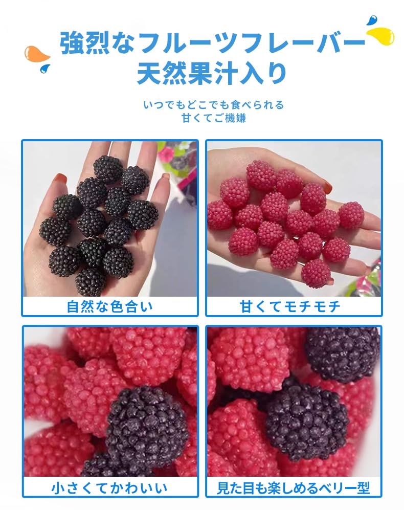 【天然果汁を加えた力強いフルーティーな味わい】天然の濃縮果汁と良質な原料を使用し、人工着色料や香料を使用せず、健康的で安全なグミキャンディをお届けします。最も純粋な果物の味を味わうために、特別に天然果汁を加え、豊かなベリーの香りを表現しています。甘酸っぱいフルーティーな風味が幾重にも重なり、まるで新鮮なベリーを一口かじったかのような、フレッシュでナチュラルな味わいが後を引きます。