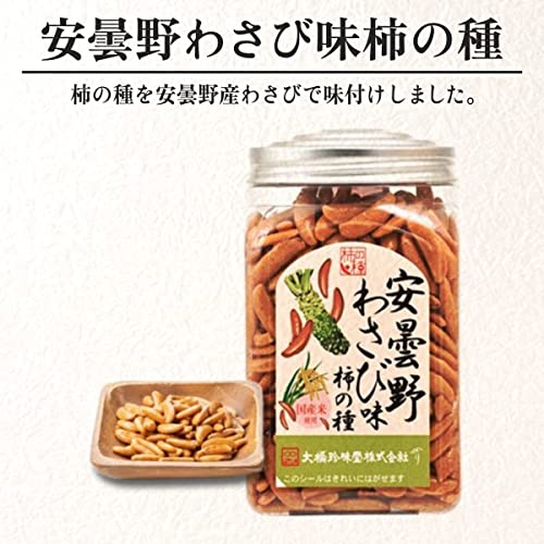 【安曇野わさび味柿の種】でん粉(国内製造)、米(国産)、しょうゆ、砂糖、乳糖、デキストリン、発酵調味料、唐辛子、わさび/加工デンプン、調味料(アミノ酸等)、香料、カラメル色素、乳化剤、酸味料、(一部に小麦・乳成分・大豆を含む)〔栄養成分表示(100g当たり):〕熱量388kcal、たんぱく質6.0g、脂質1.1g、炭水化物88.5g、食塩相当量1.4g (この表示値は、目安です). / 賞味期限:240日