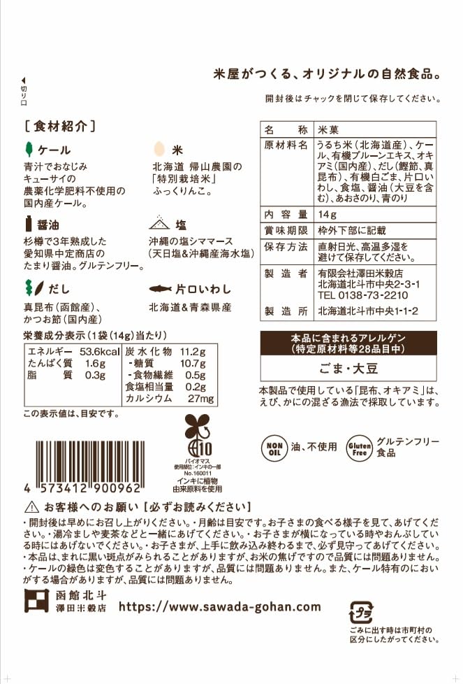 原材料:うるち米(北海道産)、ケール、有機プルーンエキス、オキアミ(国内産)、だし(鰹節、真昆布)、有機白ごま、片口いわし、食塩、醤油(大豆を含む)、あおさのり、青のり
