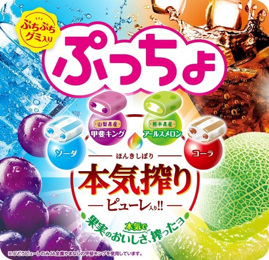 【ぷっちょ 本気搾り ピューレ入り】4つの味が楽しめる“本気搾り”のぷっちょ。本物のブランド果実を一生懸命搾ったピューレを使用した「本気搾りMIX」です。果実のよりリアルな味わいを表現し、さらに美味しくなりました。