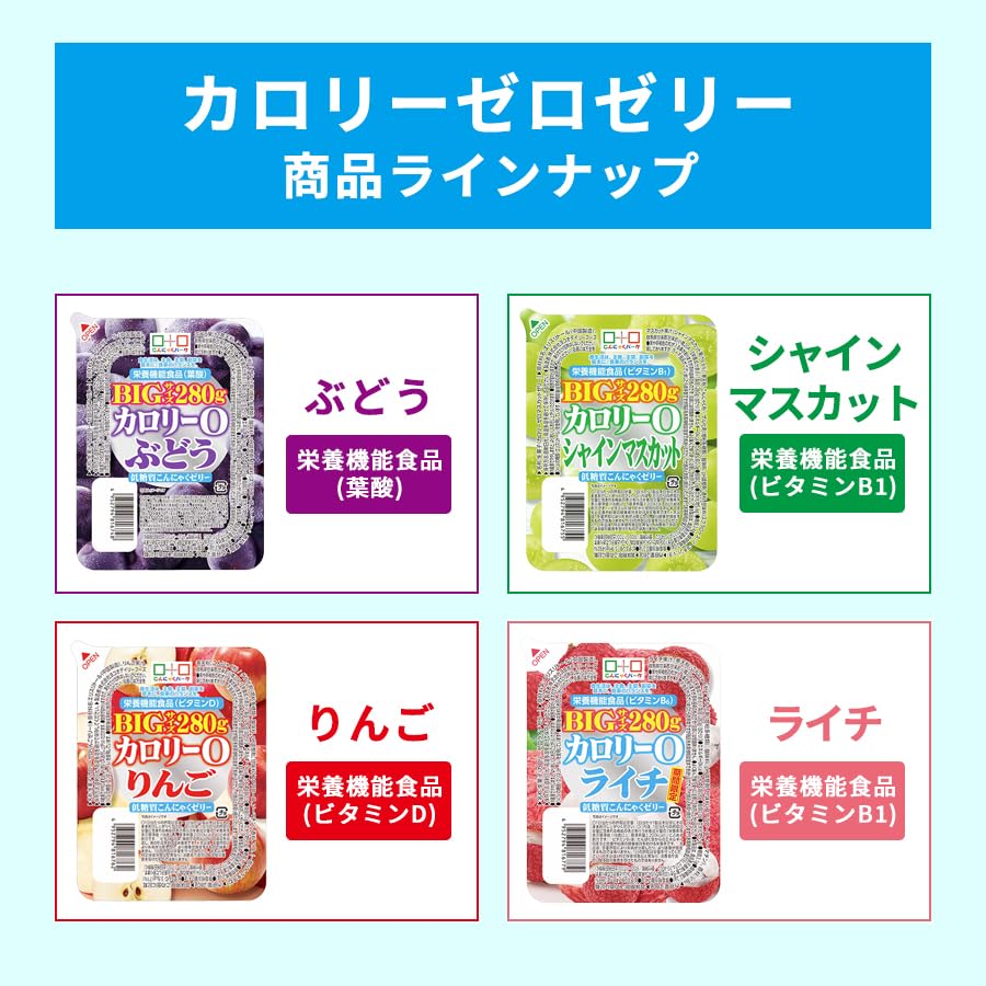 低糖質、カロリーゼロのぷるっと食感のこんにゃくゼリーシャインマスカット味です。ビタミンB1を含んだ栄養機能食品にリニューアルしました。食物繊維の豊富な寒天入りです。