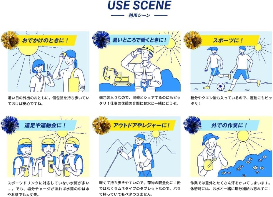 ナトリウムとともに汗によって体から失われるミネラル「カリウム」を配合しています。塩分に加えて、クエン酸とビタミンCも配合しています