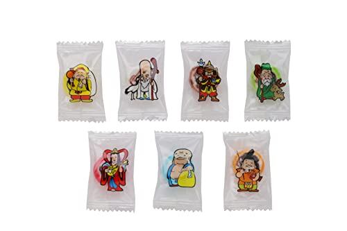 毘沙門(茶)=チョコ味、大黒(黄)=レモン味、弁財天(赤)=イチゴ味、福禄寿(白)=グレープフルーツ味、寿老人(緑)=メロン味、恵比須(橙)=オレンジ味、布袋(青)=ソーダ味