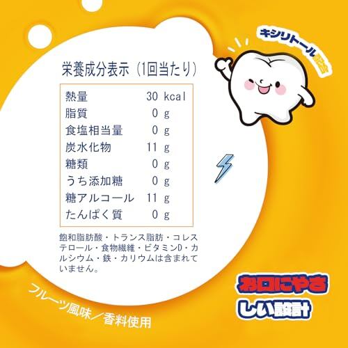 キシリトール高配合—甘味料の約50%にキシリトールを使用したシュガーフリーロリポップ。砂糖ゼロでもフルーティーな甘さですっきり後味。歯を気づかうキッズ&ファミリーのおやつや食後のリフレッシュにぴったりです。