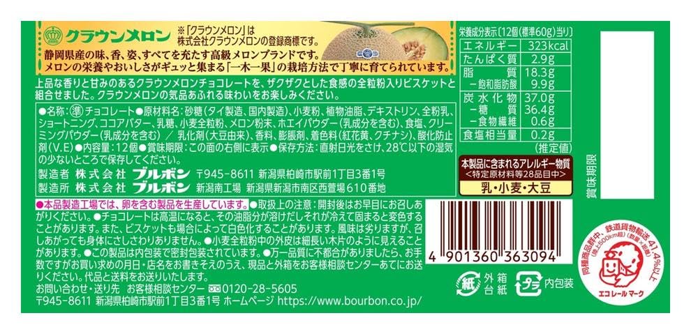 原材料:砂糖(タイ製造、国内製造)、小麦粉、植物油脂、デキストリン、全粉乳、ショートニング、ココアバター、乳糖、小麦全粒粉、メロン粉末、ホエイパウダー(乳成分を含む)、食塩、クリーミングパウダー(乳成分を含む) / 乳化剤(大豆由来)、香料、膨脹剤、着色料(紅花黄、クチナシ)、酸化防止剤(V.E)
