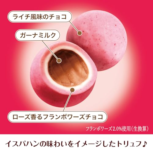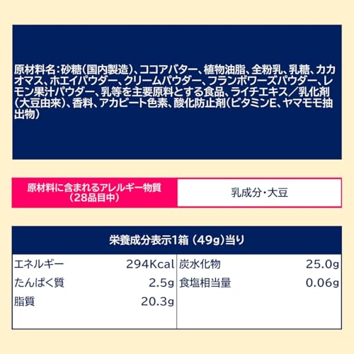 原材料:砂糖(国内製造)、ココアバター、植物油脂、全粉乳、乳糖、カカオマス、ホエイパウダー、クリームパウダー、フランボワーズパウダー、レモン果汁パウダー、乳等を主要原料とする食品、ライチエキス/乳化剤(大豆由来)、香料、アカビート色素、酸化防止剤(ビタミンE、ヤマモモ抽出物)