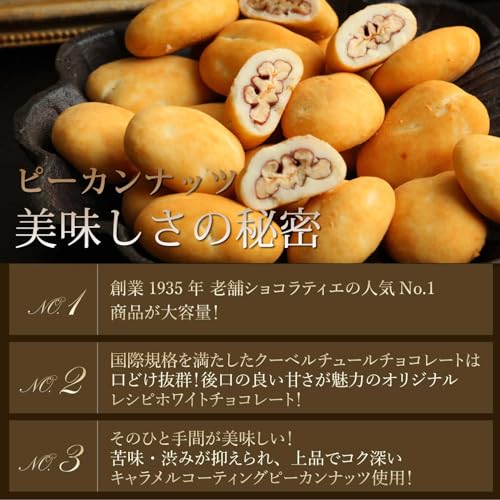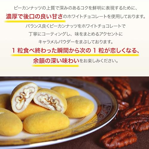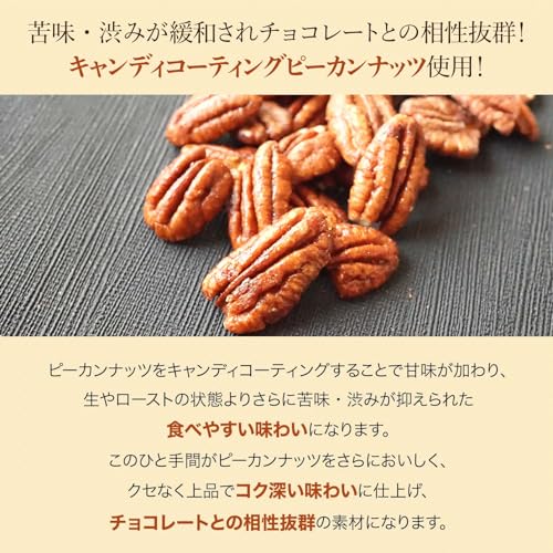 原材料名:ピーカンナッツ(アメリカ産)、ココアバター、砂糖、全粉乳、キャラメルパウダー(乳を含む)、乳糖、脱脂粉乳、植物油脂/乳化剤(大豆由来)、香料