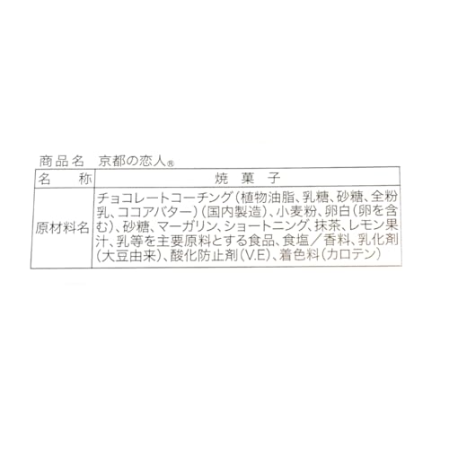 原材料名 砂糖、小麦粉、卵白、植物油脂、マーガリン、乳糖、全粉乳、ココアバター、レモン果汁、抹茶、食塩、香料、乳化剤、酸化防止剤(V.E)、着色料(カロチン)、(原材料の一部に卵、大豆を含む)