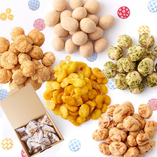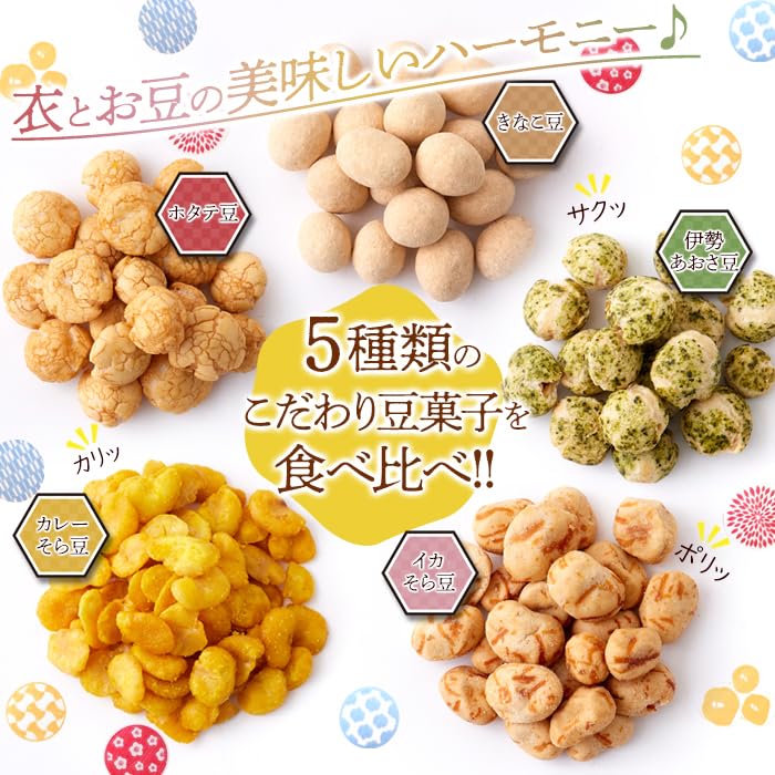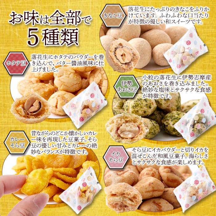 ✅【お味は全部で5種類】落花生にたっぷりきなこをふりかけたきなこ豆、落花生にホタテパウダーをかけバター醤油風味に仕上げたホタテ豆、小粒の落花生に伊勢志摩産のあおさを巻き込んだ伊勢あおさ豆、そら豆の甘みとカレーのバランスが絶妙なカレーそら豆、そら豆にイカパウダーと切りイカを混ぜこんだイカそら豆の5種類が楽しめます♪