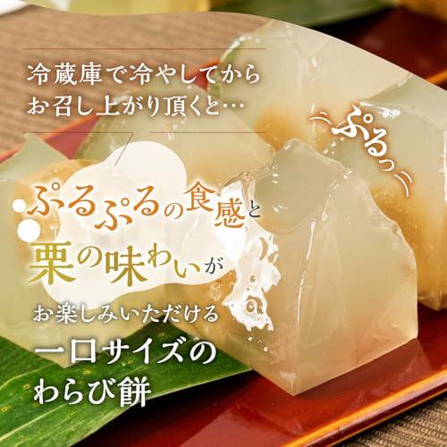 【栗きんとんわらび餅】飛騨に流れる名水を使用したわらび餅。 贅沢に栗きんとん1個をわらび餅に入れ込みました。 一口サイズで個包装タイプなのでお茶請けにもピッタリの一品です。