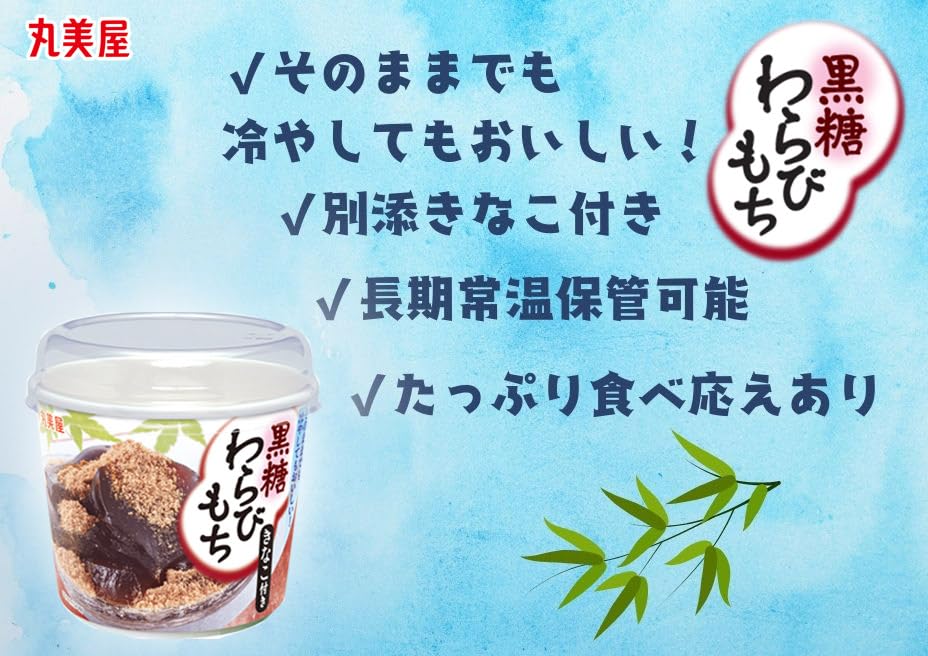 原材料:[黒糖わらびもち]砂糖(上白糖(国内製造)、黒糖)、寒天、ぶどう糖、でん粉、わらび粉/ゲル化剤(加工でん粉、増粘多糖類)、トレハロース、(一部に大豆を含む)| [別添きなこ]きな粉、砂糖、食塩/卵殻カルシウム、(一部に卵・大豆を含む)