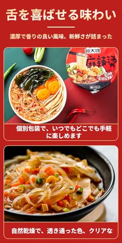 【便利で迅速、いつでも楽しめます】現代の忙しい生活では、時間は貴重です。この辛い鍋のセットは、忙しい時の完璧な食事の相棒です。水を加熱し、調味料パックと具材を加えるだけの簡単な手順で、数分で蒸気立ち上る香ばしい辛い鍋が完成します。朝急いでいる時、オフィスで残業している時、夜遅くまでドラマを一気見している時でも、いつでもバケツを開けて食事の悩みを素早く解決できます。美味しさを遅らせることなく、いつでも楽しめます。さらに、6パックセットは自宅に常備するのに最適で、いつでも食欲を満たすことができます。