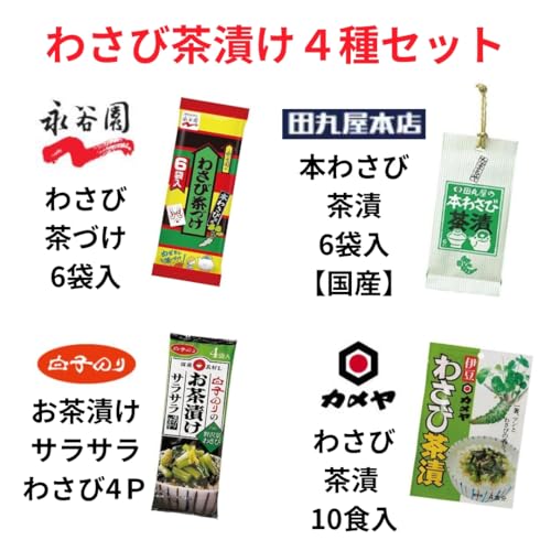わさび茶漬け4種セットです。セット内容は、永谷園 わさび茶づけ(本わさび使用)、白子のり お茶漬けサラサラわさび、田丸屋 本わさび茶漬、カメヤ わさび茶漬けの4種です。