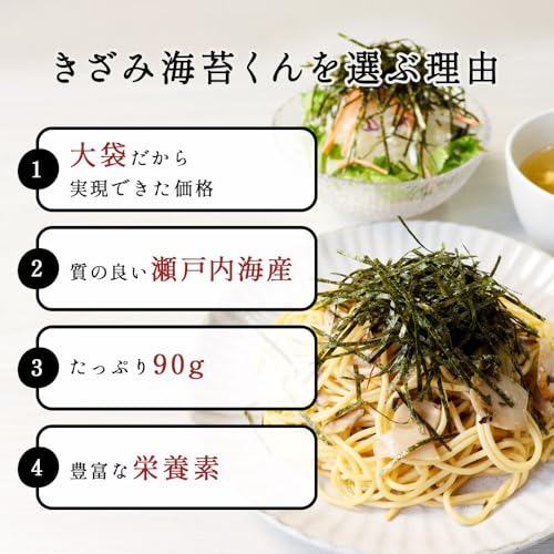 【ビックサイズの重量級!きざみ海苔くん】日本生まれ!小分けでなく、90gの大袋という業務用サイズにしたことによって、大容量でもお求めやすい価格を実現しました。きざみ海苔を多くストックしておきたい、コスパのいいきざみ海苔を探している、ある程度質のいいきざみ海苔が欲しい、簡単に栄養のある食生活を送りたい、、、そんなあなたのためのきざみ海苔です。