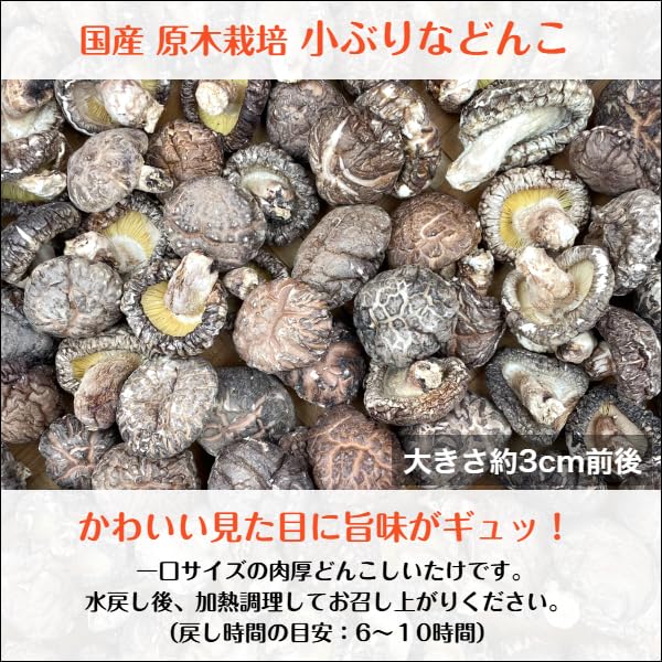 かわいい見た目に旨味がギュッ! じっくりと育ち美味しい状態で採取された”どんこ”しいたけ。 直径約3~4mの一口サイズで使いやすい大きさです。 クヌギやコナラなど、自然の木を使用して 農薬を使用せずに栽培された国産原木椎茸です。 原木栽培ならではの肉厚で風味豊かな椎茸を是非、ご賞味ください。