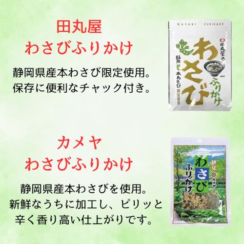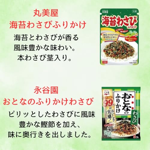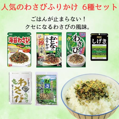 わさびふりかけ 6種セットです。セット内容は、丸美屋 海苔わさびふりかけ、永谷園 大人のふりかけ わさび、はごろもフーズ パパッとふりかけ わさび、三島食品 しげき、田丸屋 わさびふりかけ、カメヤ わさびふりかけの6種セットです。