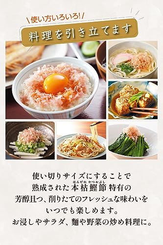 【トッピングやだしにも最適! プレミアムな本枯鰹節削りぶし】熟練の技と伝統製法で丁寧に作られた、すっきりとした上品でまろやかな味と香りが特徴の鰹節専門店こだわりの国内製造の本枯鰹節を使用。口当たりソフトにトッピング向けの形状に削り上げました。お浸しやサラダ、炒め物等のトッピングがオススメ。【本枯鰹節の特長】カツオの選別から製造まで、じっくりと日数をかけて、丁寧に仕上げられた鰹節のみが「本枯鰹節(ほんがれかつおぶし)」と呼ばれます。にんべんではカビ付けと天日干しを4回以上繰り返し、本枯鰹節が完成するまでに約半年の手間ひまかけて作り上げた逸品です。
