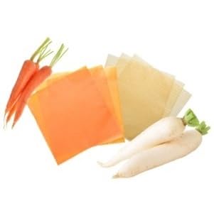 ミニサイズ(通常サイズの4分の1)5枚入り ・単品サイズ:100×95×0.1mm ・風袋込重量:7g ・保存方法:常温(直射日光は不可)、高温多湿でない場所で保存 栄養成分 (1枚当たり) エネルギー 3.93kcal タンパク質 0.06g 脂質 0.04g 炭水化物 0.84g 食塩相当量 0.001g ニンジン、カボチャ、トマト、ダイコン 各1パックずつのアソートセット