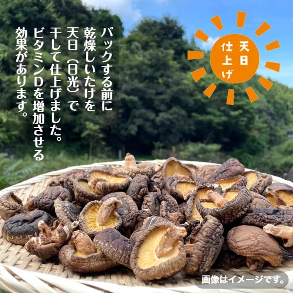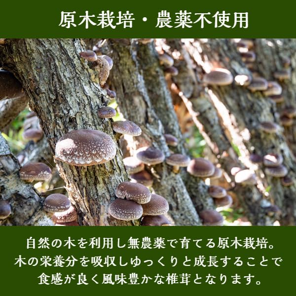 クヌギやコナラなど、自然の木を使用して 農薬を使用せずに栽培された国産原木椎茸です。 肉厚な椎茸を厳選して使用しております。 機械乾燥された椎茸をパックする前に さらに天日(日光)で干して仕上げました。 ビタミンDを増加させる効果があります。 原木栽培ならではの肉厚で風味豊かな椎茸を是非、ご賞味ください。