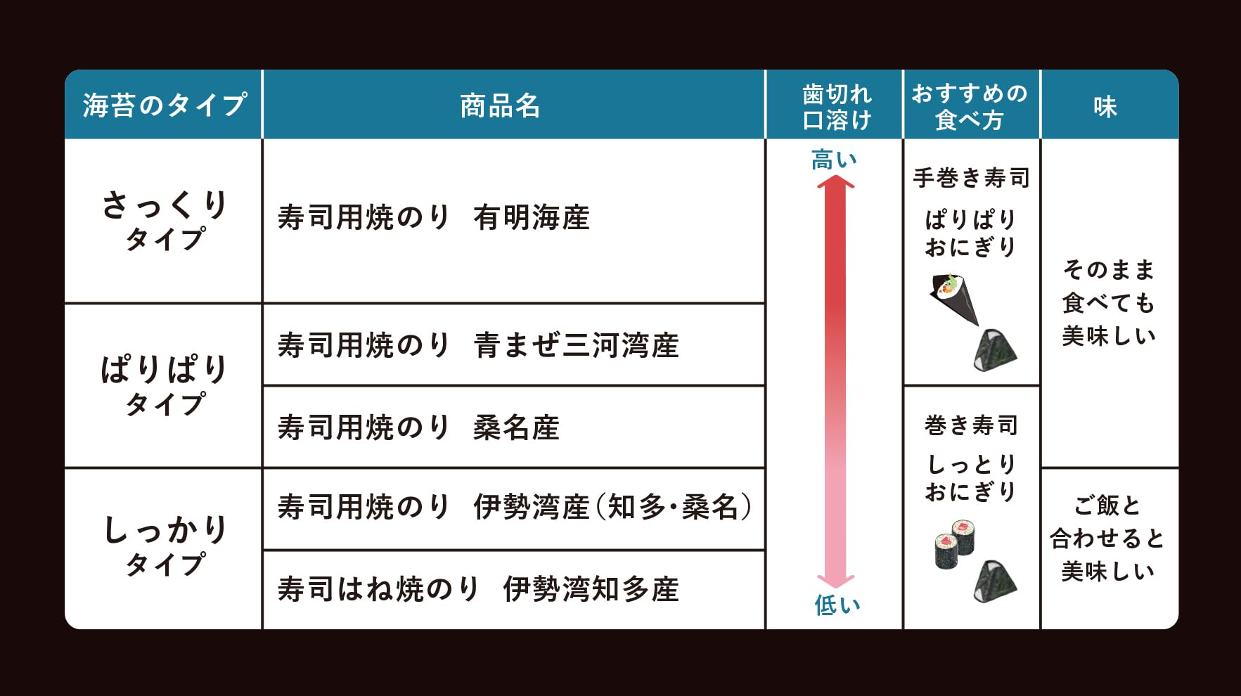 海苔のタイプ:しっかりタイプ(淡泊) オススメの食べ方:しっとり海苔まき、しっとりおにぎり ※海苔自体にあまり味がないため、ご飯に巻いてご使用いただくことをお勧めします。
