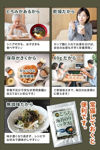 たっぷり使える60g入り。湿気を防ぐチャック付き袋で、保存もしやすく、使いたいときにすぐ使えます。乾燥タイプのため、常温での長期保存が可能。毎日の料理にいつもで手軽に取り入れられます。