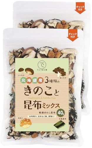 でらうま工房 国産 乾燥きのこミックス40g 北海道産 4種(しいたけ・舞茸・なめこ・きくらげ) 無添加 味噌汁の具 非常食 (2個セット, 3種キノコと昆布)