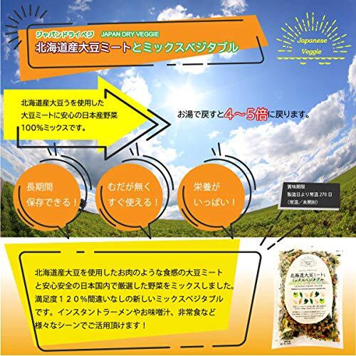 ・北海道産の大豆から作られた大豆ミートと日本のおいしい野菜をミックスしました。大豆ミートは栄養豊富な大豆を原料とした植物性のお肉です。お湯で戻すと限りなくお肉に近い食感、味わいをお楽しみ頂けます。野菜は低温で長時間ゆっくり乾燥させたエアーズドライ製法により生に近い食感・風味をお楽しみ頂けます。大豆ミートと野菜のミックスはお肉が苦手な方はもちろん野菜不足な現代社会におすすめの一品です。 熱湯で5分戻すだけで簡単クッキング Easy cooking by returning to hot water for 3-5 minutes ※お好みでお時間を調整してください。 Please adjust your time as you like.