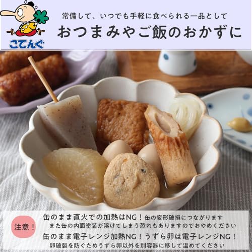 原材料:こんにゃく、大根、うずら卵、ちくわ、さつまあげ、がんもどき、たん白加水分解物、糖類(砂糖、還元麦芽糖、乳糖)、風味原料(鯛エキス、かつおぶしエキス、かつおぶし粉末、こんぶエキス、かつおエキス)、食塩、酵母エキス/調味料(アミノ酸等)、ソルビット、加工デンプン、乳化剤、水酸化Ca、(一部に小麦・卵・乳成分・ごま・大豆・豚肉・ゼラチンを含む)