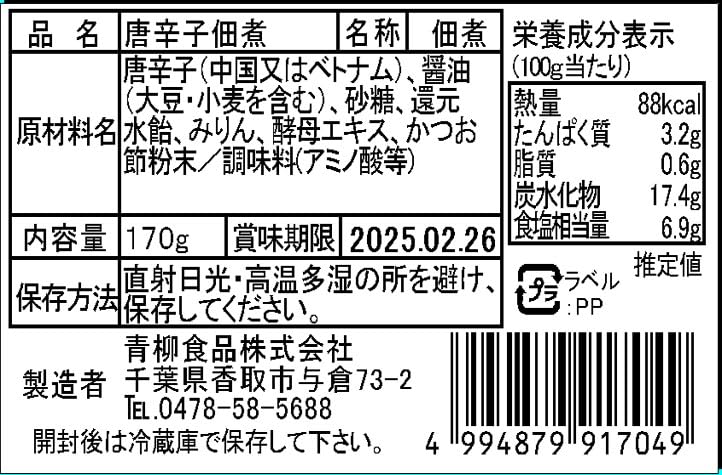 原材料:唐辛子、醤油、砂糖、還元水飴、みりん、酵母エキス、かつお節粉末、調味料