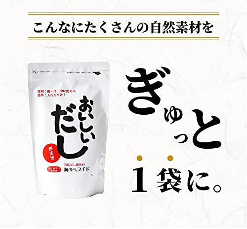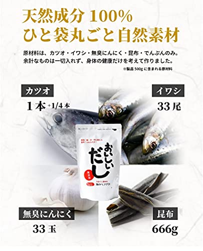 【美味しい食べ方】●200ccのお湯に、おいしいだし10gを溶かし梅干しを入れれば美味しい栄養スープになります。 ●チャーハン、野菜炒め、カレー、シチューに炒めながら又は煮込みながら振り入れるだけでコクが出ます。 ●少量のお湯に溶かして卵に加え、だし巻き卵やオムレツ、茶碗蒸しに。