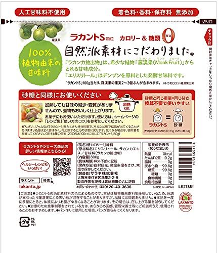 「ラカントS 顆粒 800g」は、長寿の神果「羅漢果(ラカンカ)」から抽出した高純度エキスと、発酵ブドウ糖の「エリスリトール」でできたカロリーゼロ、低GIの自然派甘味料です。植物由来原料※100%の自然派素材にこだわりました。コクのある甘みで、加熱料理もおいしく仕上がります。コーヒー・紅茶にもおすすめです。砂糖と同じ重量で同じ甘さになるため、面倒な重量換算はいりません。摂取カロリーを制限されている方に。着色料※※・香料無添加。※エリスリトールはトウモロコシ・ジャガイモ・サツマイモ由来、ラカンカエキス・ラカンカ抽出物は羅漢果由来。※※本品の色は原材料の色によるものです。