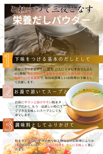 【洋風・中華にも】“和風だし”としてだけでなく“洋風”にも“中華”にもお使い頂けます。味噌汁やうどん、煮物、ポトフ、中華スープ、炊き込みご飯、野菜炒め、チャーハン、焼きそば、パスタ、おにぎり等、幅広い料理でお楽しみください。お湯を注ぎ、梅干しや塩をほんのひとつまみで“おいしいスープ”としてもおすすめです!