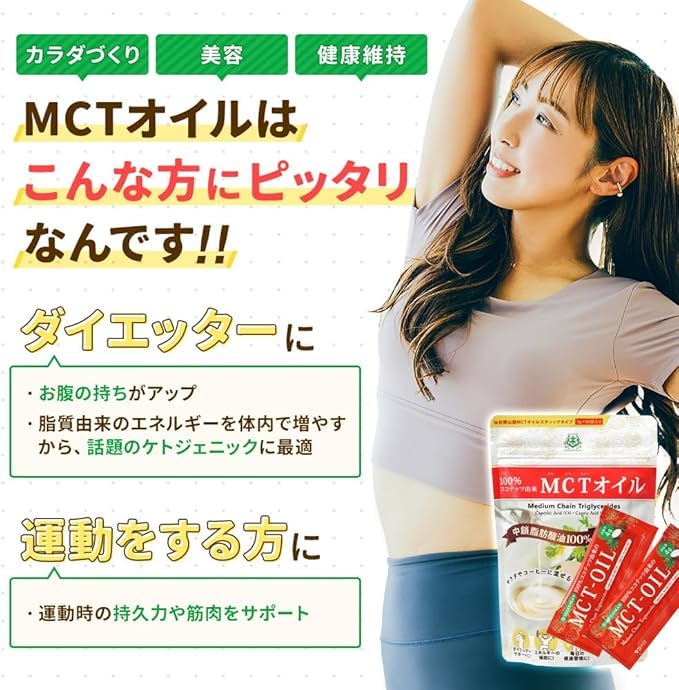 ✅MCTオイルとは:サラダ油など通常の油と違う、「中鎖脂肪酸」という種類のオイル。✅MCTオイルはエネルギーになるスピードが通常の油の4倍。だから、少量でエネルギーになります。✅糖質制限やケトジェニックと組み合わせることで引き締まった身体づくりをサポートする効果が期待できます!