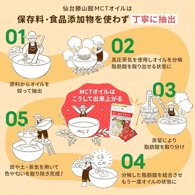 ✅【仙台勝山館mctオイルはココナッツ100%】✅原料は希少なココナッツを100%使用 ココナッツ以外のヤシの実は使用しておりません ✅中鎖脂肪酸100% エネルギー効率の良いC8:C10のみを6:4で抽出しました。✅【300年以上続く食の老舗企業が作る、丁寧なmctオイル】✅化学溶剤を一切つかわない、ナチュラルな蒸留製法で抽出 ✅国際規格ISO9001の工場で丁寧に抽出 ✅ 国内充填され、みなさまの元にお届け