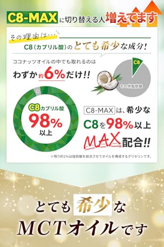 ✅原料:希少なココナッツ由来100%。さらにその中から希少な「C8(カプリル酸)」のみを抽出 ✅C8は、中鎖脂肪酸の中でも最も消化吸収が早くすぐエネルギーになります。