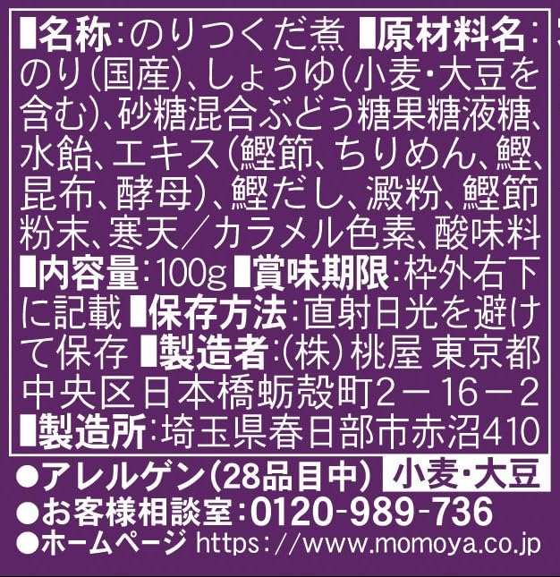 原材料:のり(国産)、しょうゆ(小麦・大豆を含む)、砂糖混合ぶどう糖果糖液糖、水飴、エキス(鰹節、ちりめん、鰹、昆布、酵母)、鰹だし、澱粉、鰹節粉末、寒天/カラメル色素、酸味料