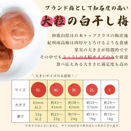 大粒・肉厚で果肉たっぷりの完熟紀州南高梅を、塩のみで漬け込んだ添加物不使用の無添加白干しです。