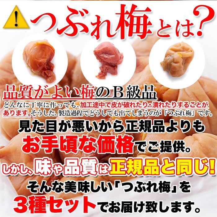 ✅【贅沢な食べ比べが実現!!梅の高級ブランド南高梅使用】梅の酸味を残し、甘味料控えめのあっさりした「まろやか」、しその風味が食欲をそそる「しそ漬け」、甘すぎず、酸っぱすぎず、ちょうどいい塩梅の甘さ「はちみつ」の紀州南高梅熟撰つぶれ梅3種を食べ比べ♪