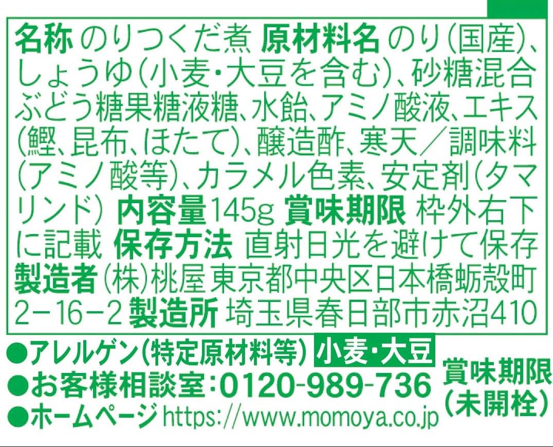 ■原材料:のり(国産)、しょうゆ(小麦・大豆を含む)、砂糖混合ぶどう糖果糖液糖、水飴、アミノ酸液、エキス(鰹、昆布、ほたて)、醸造酢、寒天/調味料(アミノ酸等)、カラメル色素、安定剤(タマリンド)