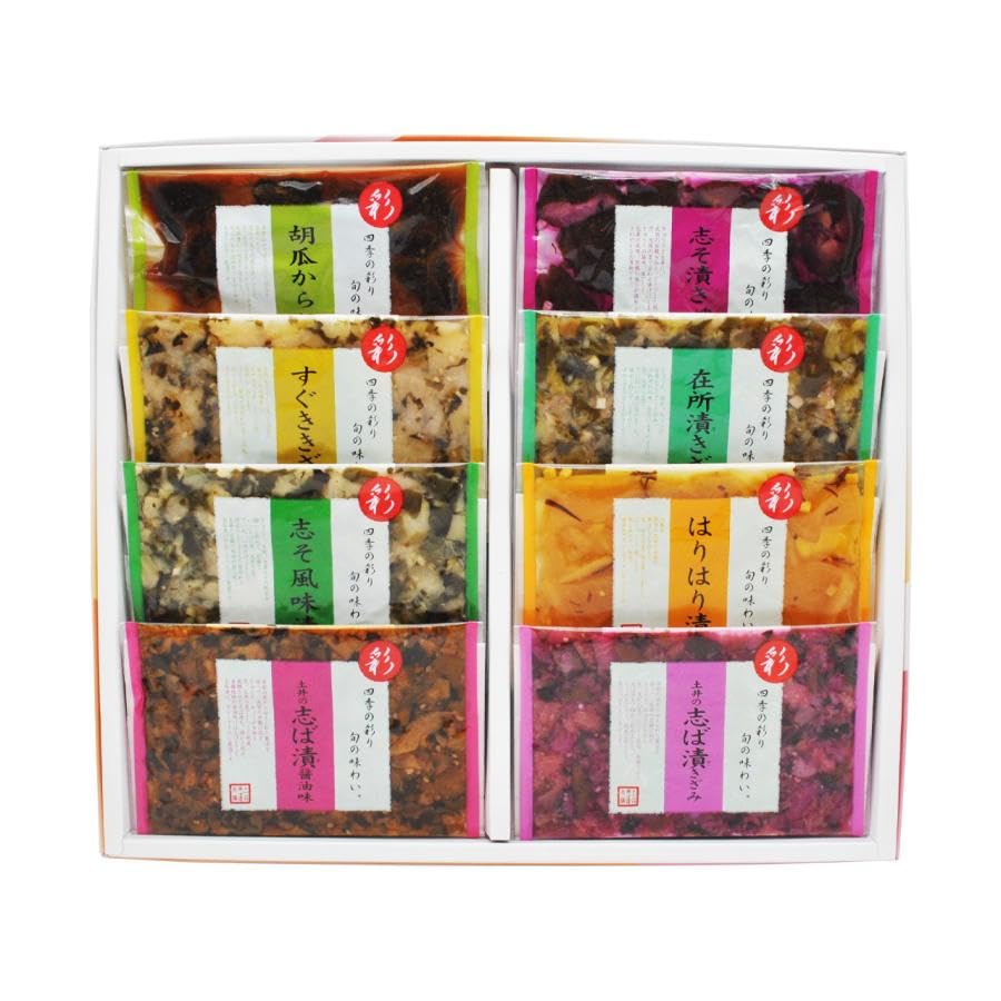 詰め合わせ内容:8種8点入(志ば漬きざみ・すぐききざみ・志そ漬きゅうり・胡瓜からし漬・志ば漬醤油味・はりはり漬・在所漬きざみ・志そ風味漬(各40g) ※原材料の一部に大豆・小麦・ごまを含みます)