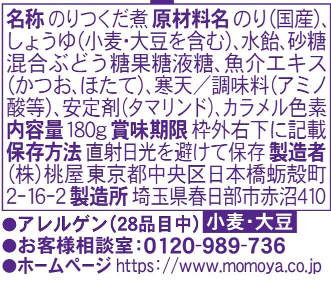 ■原材料:のり(国産)、しょうゆ(小麦・大豆を含む)、水飴、砂糖混合ぶどう糖果糖液糖、魚介エキス(かつお、ほたて)、寒天/調味料(アミノ酸等)、安定剤(タマリンド)、カラメル色素