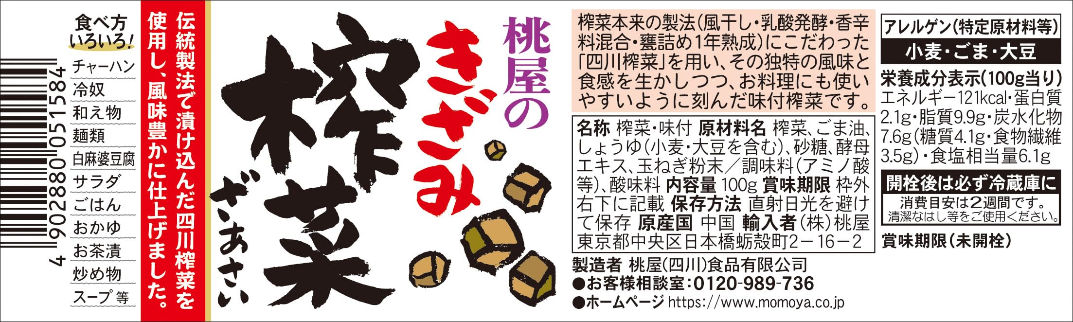 原材料:榨菜、ごま油、しょうゆ(小麦・大豆を含む)、砂糖、酵母エキス、玉ねぎ粉末/調味料(アミノ酸等)、酸味料