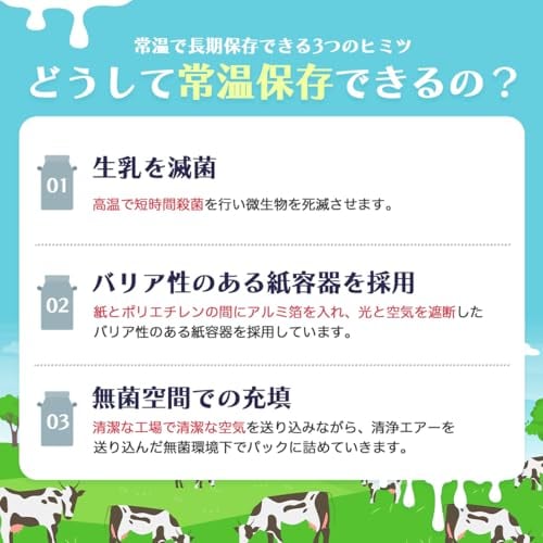 おいしさ長持ち製法により、成分無調整の生乳のおいしさがいつでも手軽に味わえ、栄養補給が可能な牛乳。 搾乳後48時間以内に生乳を受け入れ、おいしさが長持ちするよう、無菌状態で、超高温瞬間殺菌しております。生乳100%使用。