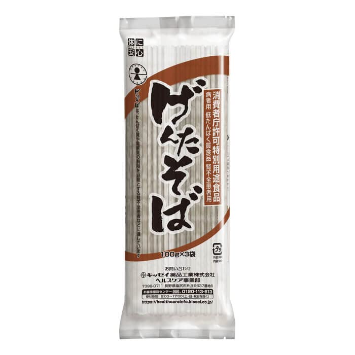 【摂取上の注意】 ●げんたそばは、医師にたんぱく質摂取量の制限を指示された方(腎不全患者、人工透析患者など)に最適な低たんぱく質そばです。 医師、管理栄養士等の指導を得てご使用いただくのが最適です。 ●げんたそばは食事療法の素材として適するもので、多く摂取することによって疾病が治癒するというものではありません。