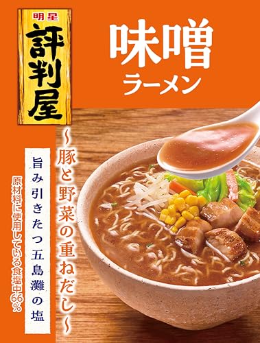 美味しく減塩できるお手軽価格の即席ラーメン。減塩訴求ブランド売上No.1(※1)!美味しく減塩できるお手軽価格の即席ラーメン「評判屋」。旨み引き立つ五島灘の塩に重ねだしで美味しさと減塩30%カット(※2)を実現してリニューアル。食べやすくつるみのあるフライ麺と、豚と野菜のだしをベースに旨みを掛け合わせた味噌スープ。麺は食べやすくつるみのあるフライ麺。スープは旨み引き立つ五島灘の塩を配合。豚ベースに野菜のだしを重ね赤味噌を合わせたまろやかな味わい。※1:インテージSRI+即席めん(袋麺・カップ麺)市場 2020年1月~2023年12月累計販売金額※2:日本食品標準成分表2020年版(八訂)即席中華めん 油揚げ 乾(添付調味料等を含むもの)(100g当たり)と比較