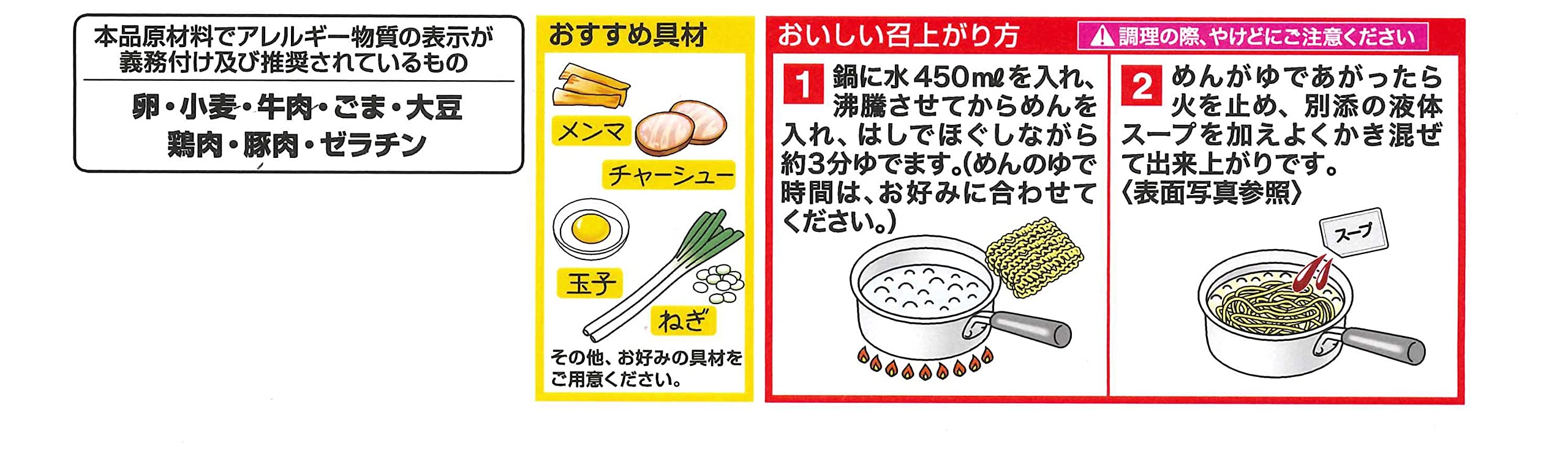 原材料:めん(小麦粉、小麦たん白、食塩、植物油脂、卵白、たん白加水分解物)、スープ(たん白加水分解物、果糖ぶどう糖液糖、砂糖、牛脂、しょうゆ、みそ、食塩、コチュジャン、野菜エキス、チキンエキス、唐辛子、しょうゆもろみ、ゼラチン、ローストガーリックペースト、にんにく、香味油、カツオエキス、香辛料)、加工デンプン、調味料(アミノ酸等)、かんすい、着色料(クチナシ、パプリカ色素、カラメル)、増粘多糖類、酸化防止剤(V.E)、乳化剤、香料、香辛料抽出物、(原材料の一部にごま、豚を含む)