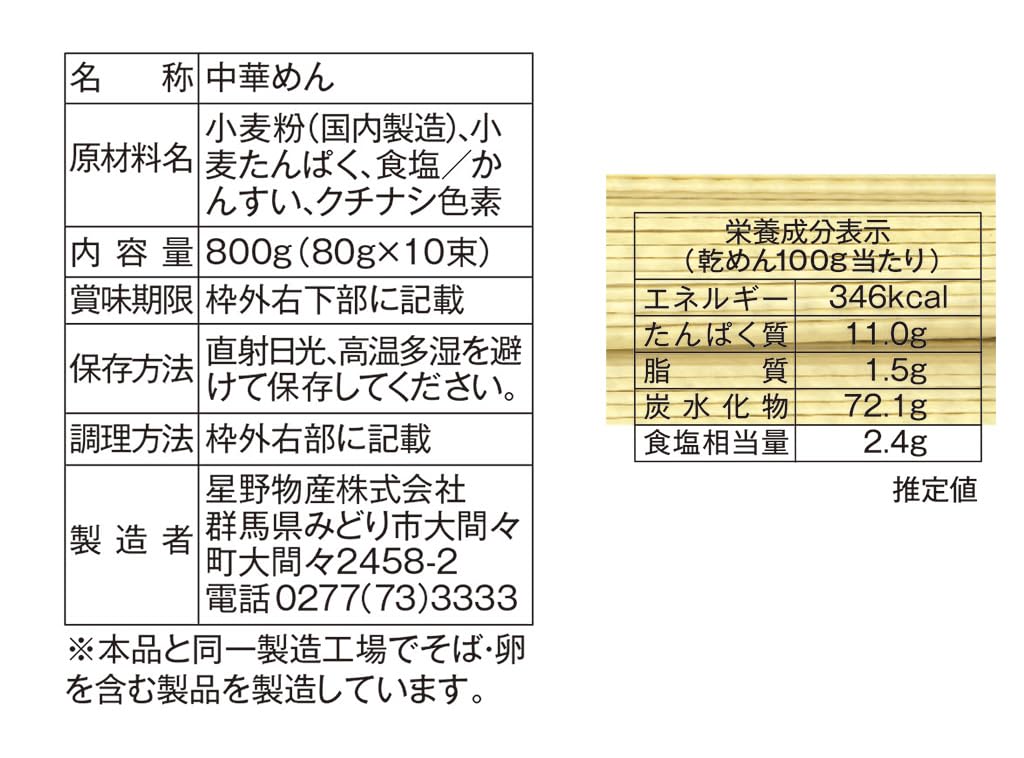 原材料:小麦粉(国内製造)、小麦たんぱく、食塩/かんすい、クチナシ色素