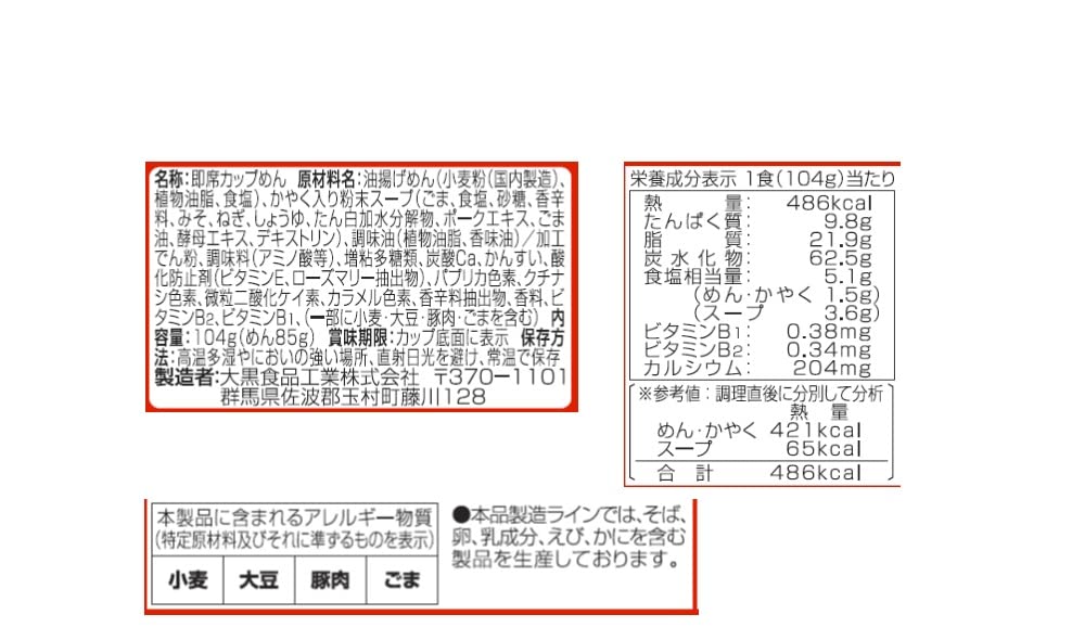 原材料:油揚げめん(小麦粉(国内製造)、植物油脂、食塩)、かやく入り粉末スープ(ごま、食塩、砂糖、香辛料、みそ、ねぎ、しょうゆ、たん白加水分解物、ポークエキス、ごま油、酵母エキス、デキストリン)、調味油(植物油脂、香味油)/加工でん粉、調味料(アミノ酸等)、増粘多糖類、炭酸Ca、かんすい、酸化防止剤(ビタミンE、ローズマリー抽出物)、パプリカ色素、クチナシ色素、微粒二酸化ケイ素、カラメル色素、香辛料抽出物、香料、ビタミンB2、ビタミンB1、(一部に小麦・大豆・豚肉・ごまを含む)